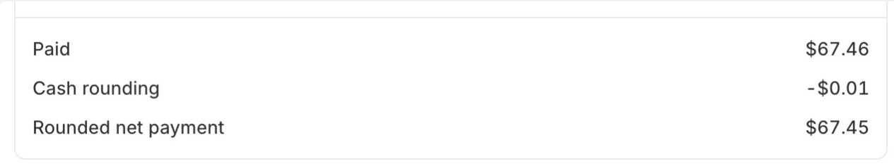 If you drill into an individual order, you may see a net payment of $67.46 cash, while the actual cash collected is $67.45 due to rounding. In this case, the “Rounded Net Payment” amount more accurately represents the true cash received.