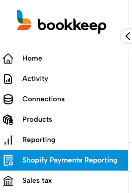 The Shopify Payments reporting view can be found in the left navigation menu within Bookkeep.