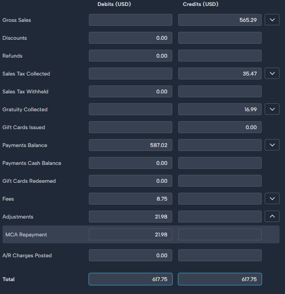 Reduces the Toast clearing account by the MCA Repayment amount, accurately reflecting the reduction in your Toast balance