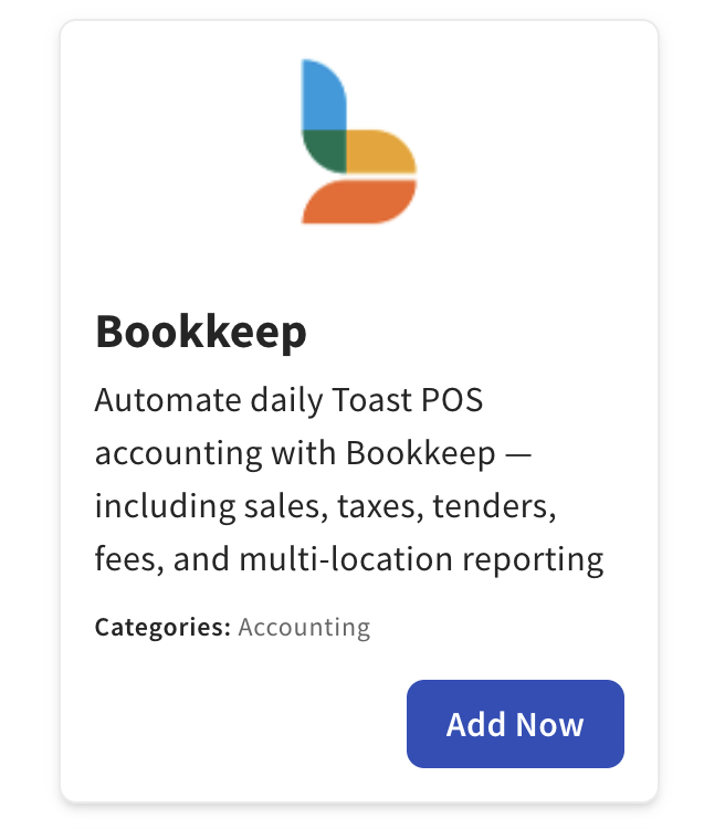 The tile represents Bookkeep’s integration in the Toast Partner Marketplace.