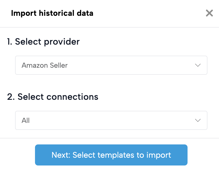 In the modal, you’ll see a dropdown listing your active app connections. First, select the app (for example, Shopify), then choose one or more specific connections under that app. This allows you to easily import data across multiple connections of the same app at once.